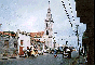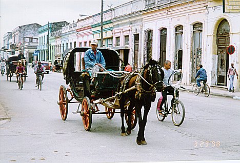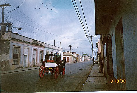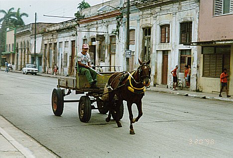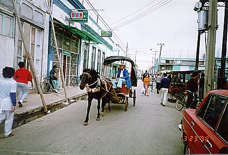 Continuing along Calzada, heading toward Varadero: We pass in front of the San Antonio Catholic Church and we have the opportunity to see another of the "accomplishments" of the Castro revolution: modern urban transportation. Ah-huh. |